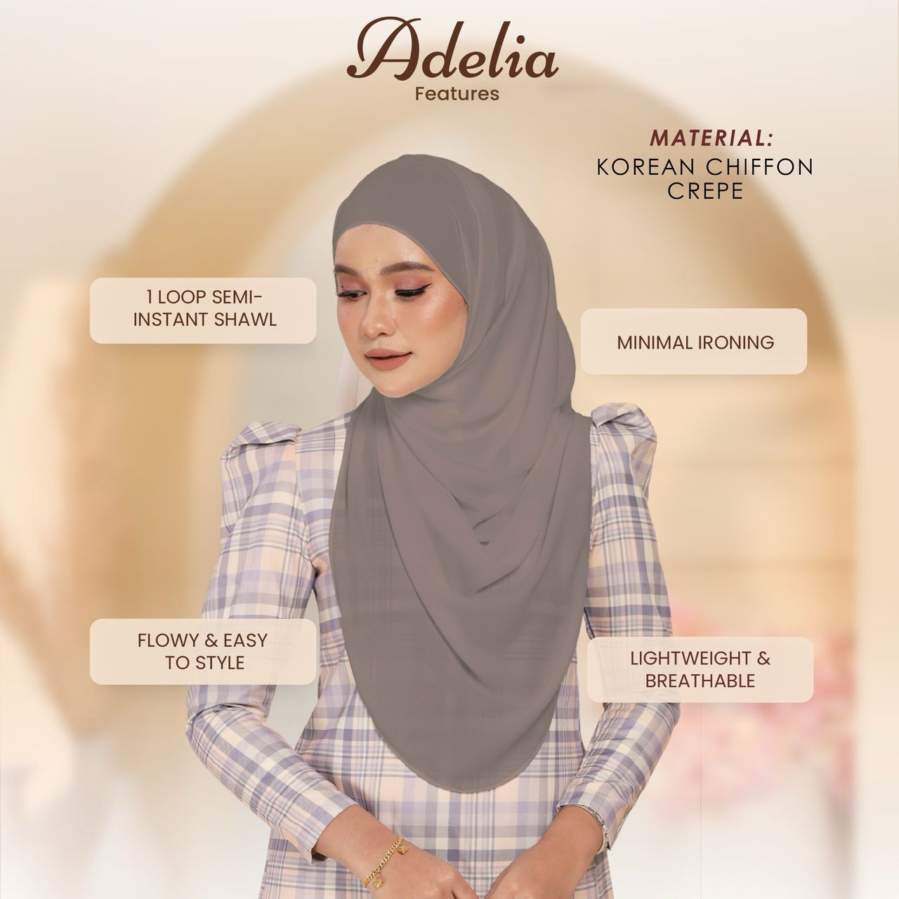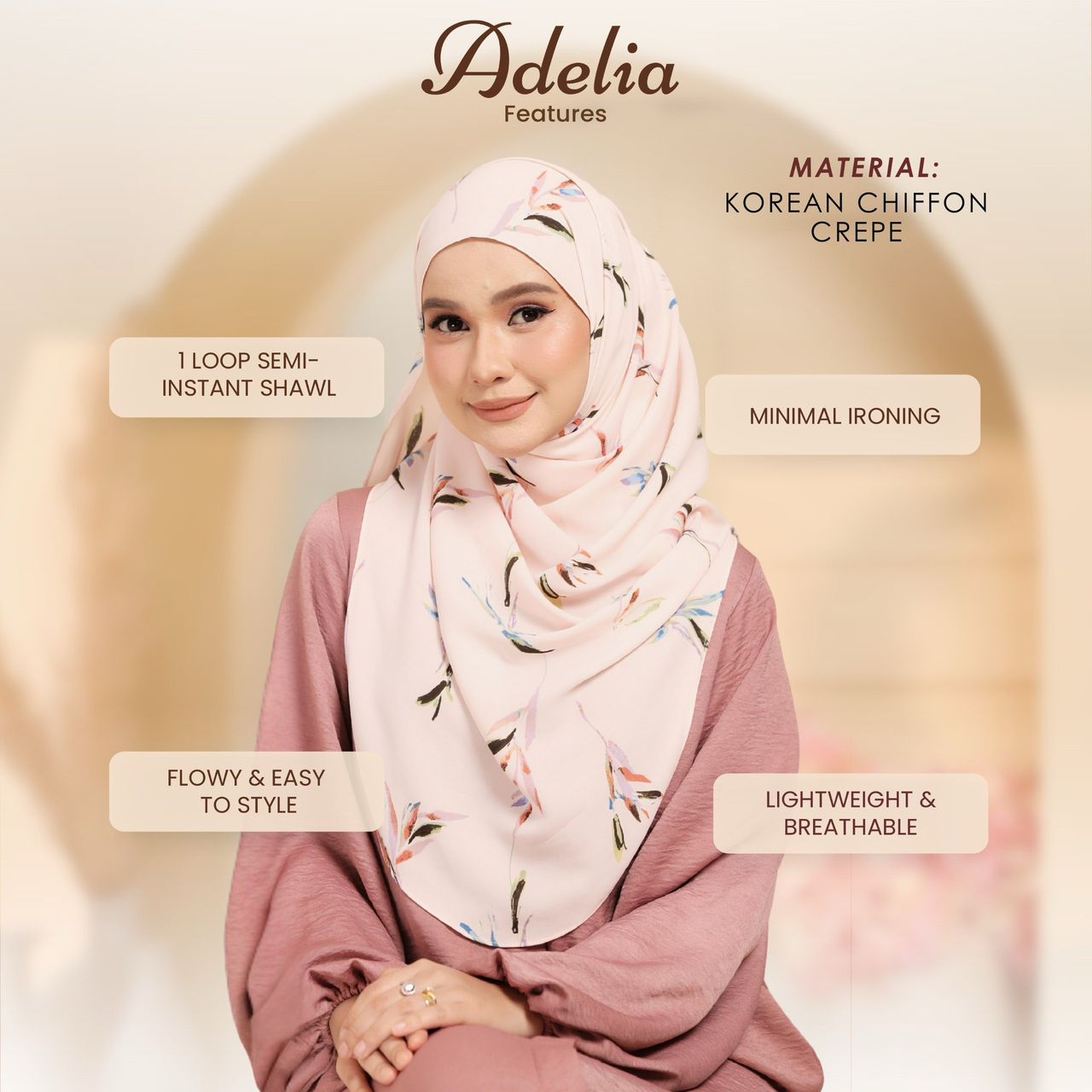 Its semi-instant design ensures effortless styling, featuring a one-face sarong style with a single loop, while the remaining fabric wraps elegantly around you. Versatile and chic, the Adelia Shawl easily transitions from day to night, adding a touch of refined elegance to any look. Style made simple, because elegance should always be effortless.