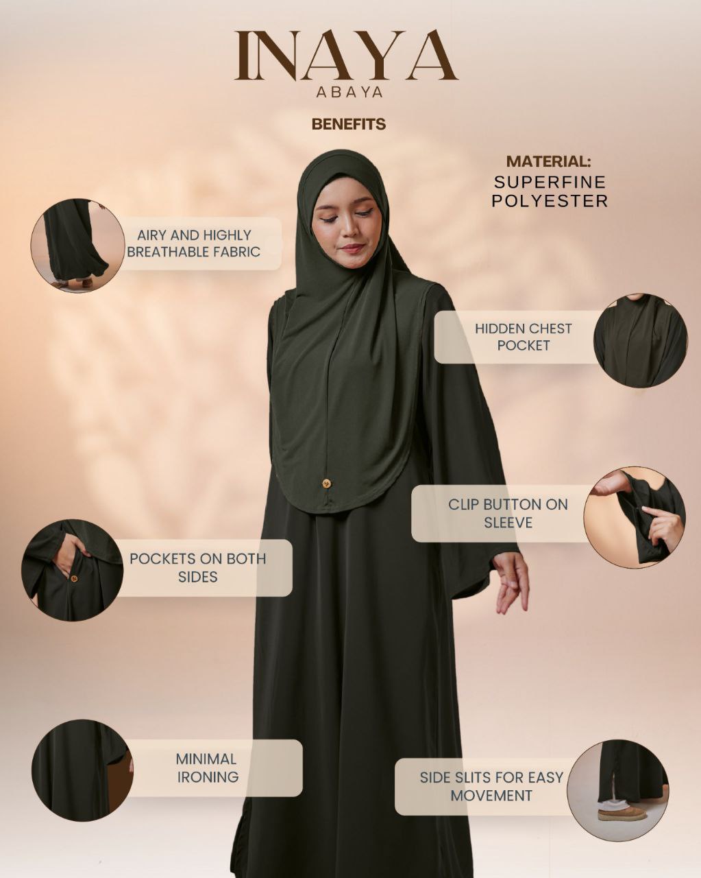 Meet the perfect fusion of style, comfort, and practicality with the Inaya Abaya. Made from luxurious superfine polyester, its airy and breathable fabric ensures you stay cool and comfortable, no matter the occasion. Thoughtfully designed with a hidden chest pocket, side pockets, and a chic clip button on the sleeve, this abaya is as functional as it is stylish. The side slits provide easy movement, while the minimal ironing requirement keeps maintenance effortless. Elevate your wardrobe with this modern classic that offers a seamless blend of elegance and convenience ♥